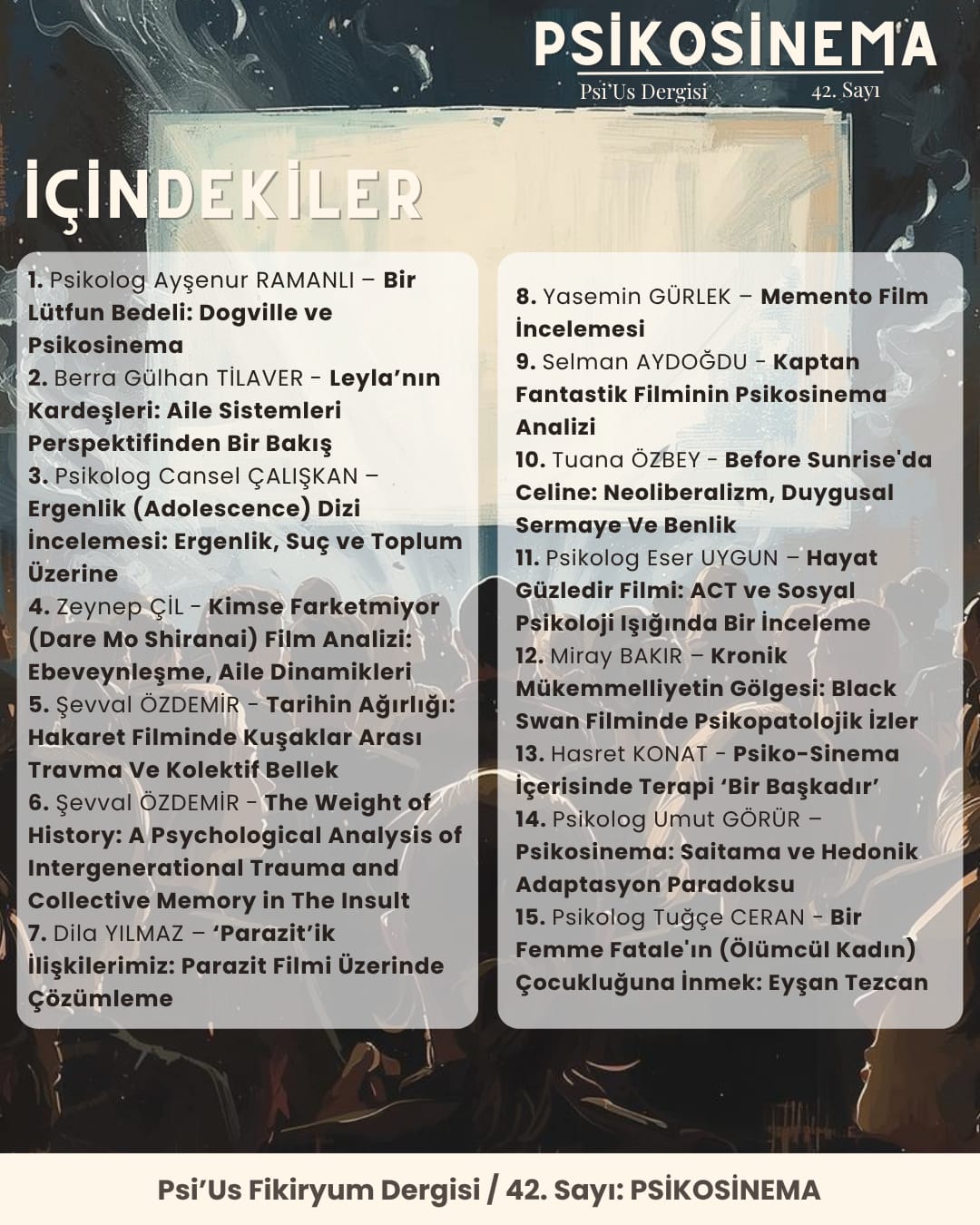 Sinema hayatın içinden dokunuşlarıyla kimlikleri, yaşantıları, duyguları ele alır. Bu nedenledir ki sinema, psikolojiden ayrı düşünülememektedir. Sahnelerde kamera açısı yalnzıca karakterlere dönmez, onların iç dünyalarını da yansıtır. Bu sahne açılarında izleyici, karakterlerin bilinçdışlarına, arzularına, korkularına adeta tanık olur. Dolayısıyla sinema ruhların dili olarak tanımlanabilir. Ancak, ruhların dilini çözümlemek her zaman kolay değildir. Nitekim sanatın içerisindeki metaforlar doğrudan verilmeyebilir. Bu nedenledir ki, Psi’Us Fikiryum dergi ekibi olarak bizler, bu metaforları sayı içerisinde daha da görünür kılmayı amaçlamaktayız! Bu tema içerisinde sinemanın yalnızca bir sanat dalı olarak görülmesinin kısır kalacağını iddia ediyor; sinemanın oyuncusundan izleyicisine, psikolojik bir deneyim alanı sunduğuna inanıyoruz. Keyifli okumalar dileriz...